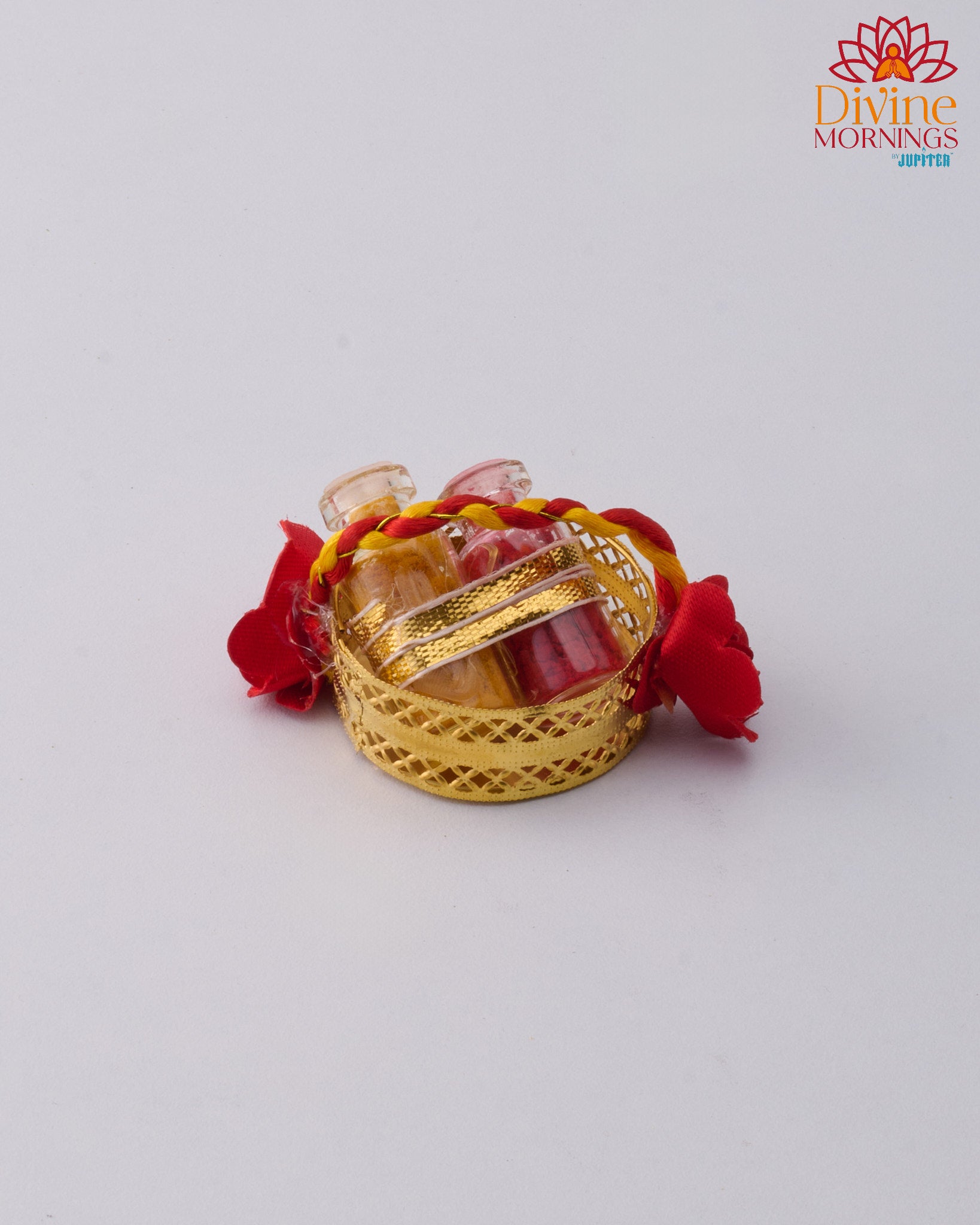 Complete your return gifts or thamboolam with our Designer Basket Haldi Kumkum Varadan! This elegant and practical item is perfect for keeping haldi kumkum, symbolizing blessings and prosperity, in a traditional and stylish way. A beautiful addition to any celebration or ceremony.