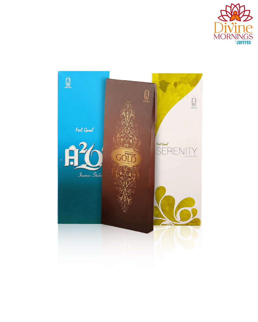 Transform your space with the Feel Good 200G Combo of 3! The refreshing scents of H2O and Serenity Agarbatti will ignite your senses, while the luxurious Gold Agarbatti adds a touch of elegance. Achieve a peaceful and uplifting atmosphere with this unique combo.