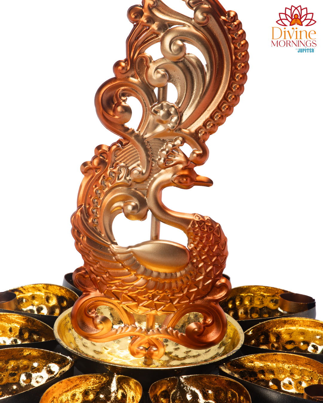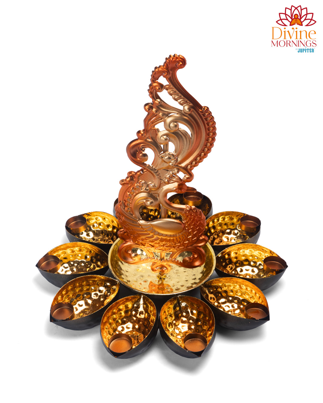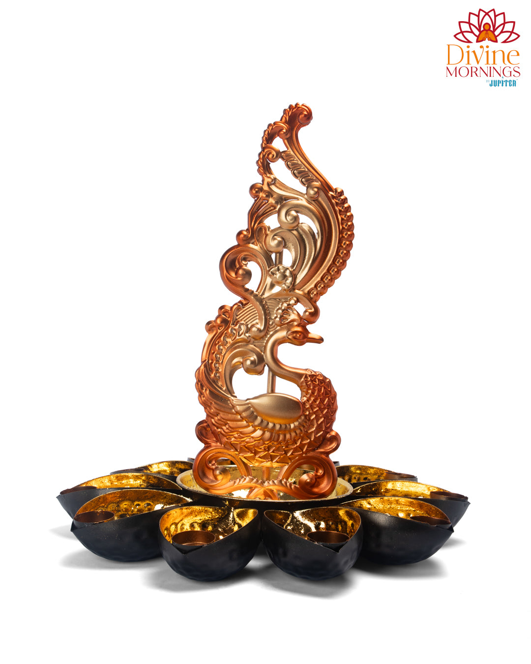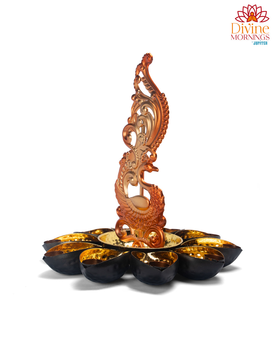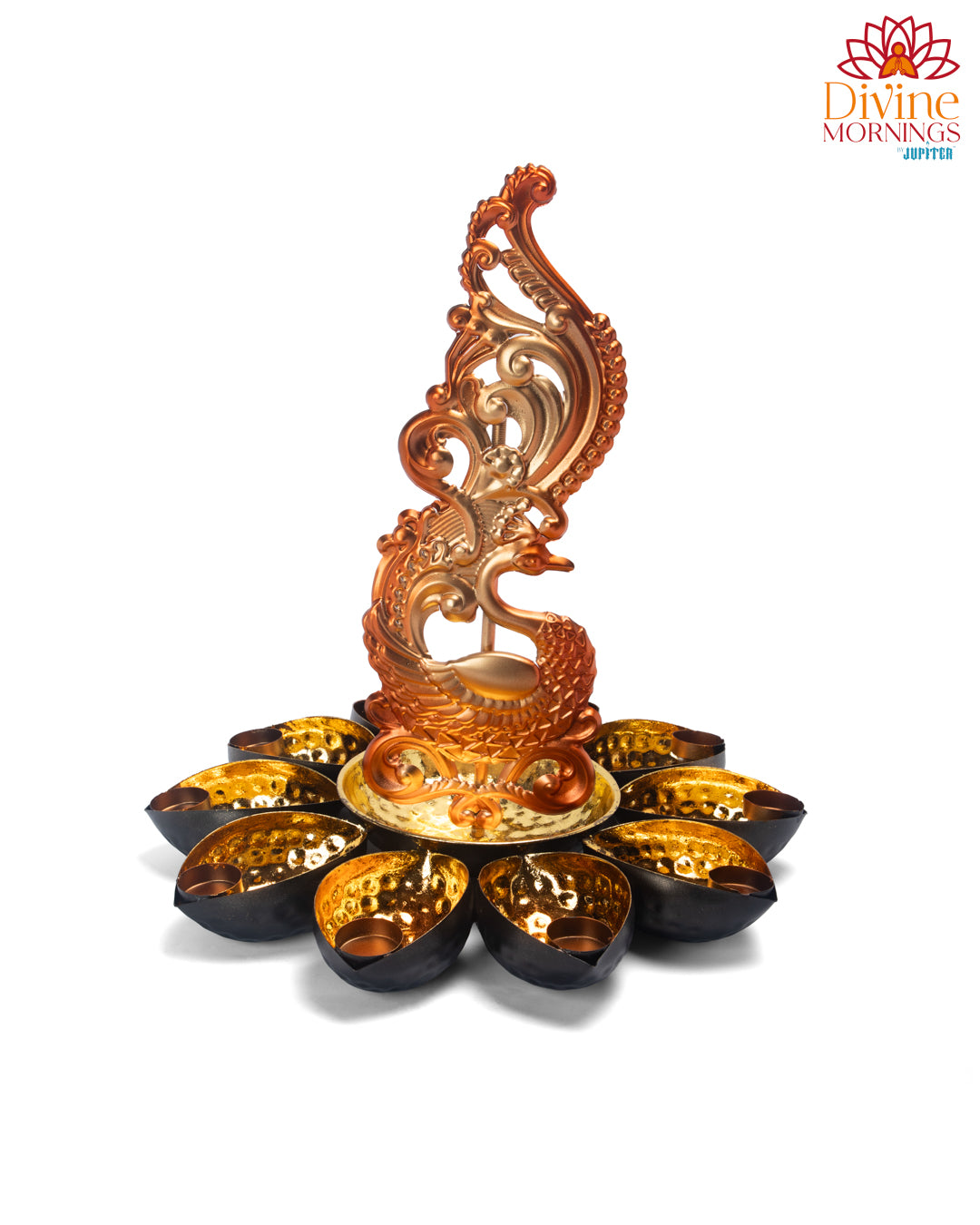 Create a grand and elegant atmosphere with the Peacock Grandeur Urli. Made of sturdy metal, this beautiful piece can hold tealights or be filled with water or milk for a stunning centerpiece. Decorate with petals to add a touch of festivity to any space. Elevate your decor with this versatile and unique piece.