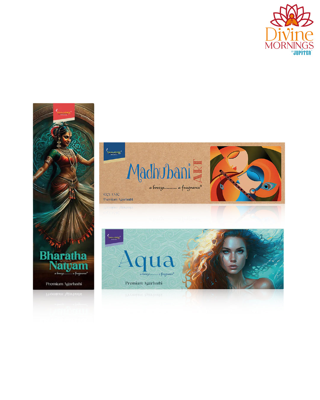 Introducing our Tanjore Mini Combo Of 3! This pack includes three unique designs: Elevate your senses with our Mini Agarbatti Combo, featuring vibrant scents of aqua, madhubani, and bharathanatyam. Immerse yourself in the captivating aromas while enhancing your spiritual practices. Experience a unique and uplifting blend in one convenient set. Ignite your passion for fragrance today!. Perfect for collectors or those looking to add some variety to their collection. Experience the beauty and vibrancy of each design. Order now!