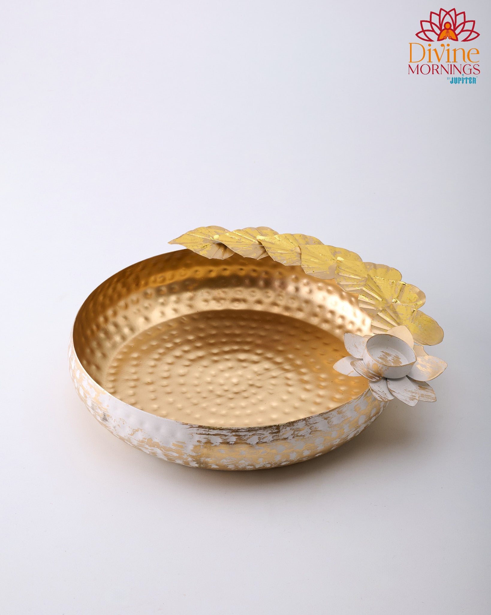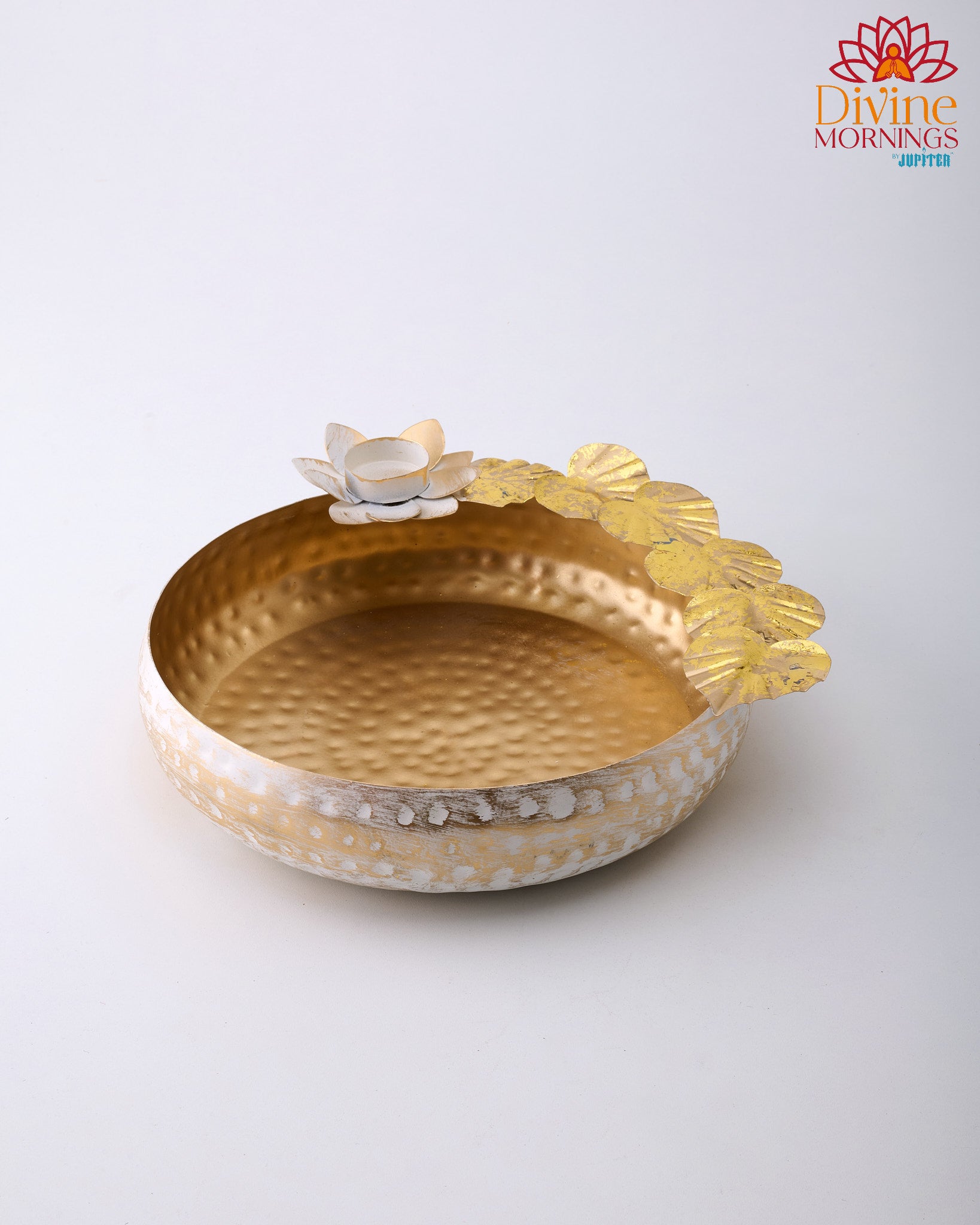 Transform your space with our White Finish Metal Urli. The premium finish adds elegance to any room, while the ability to add water and flowers creates a stunning centerpiece. Elevate your home decor with this versatile and beautiful piece!