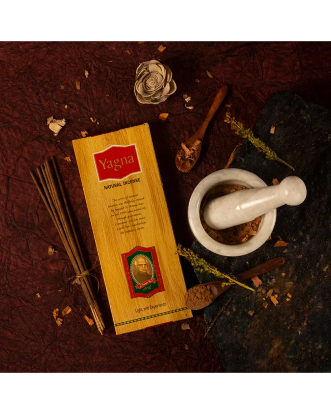 Yagna Agarbatti, a premium pack of agarbathies is a unique formulation created by our visionary founder in late 1940s and handed down through generations. 'Yagna' refers to any ritual performed in front of Agni or sacred fire, often by chanting mantras. Yagna Agarbathies is an aromatic amalgamation of all natural and pure ingredients offered to Agnidev while performing this divine prayer.